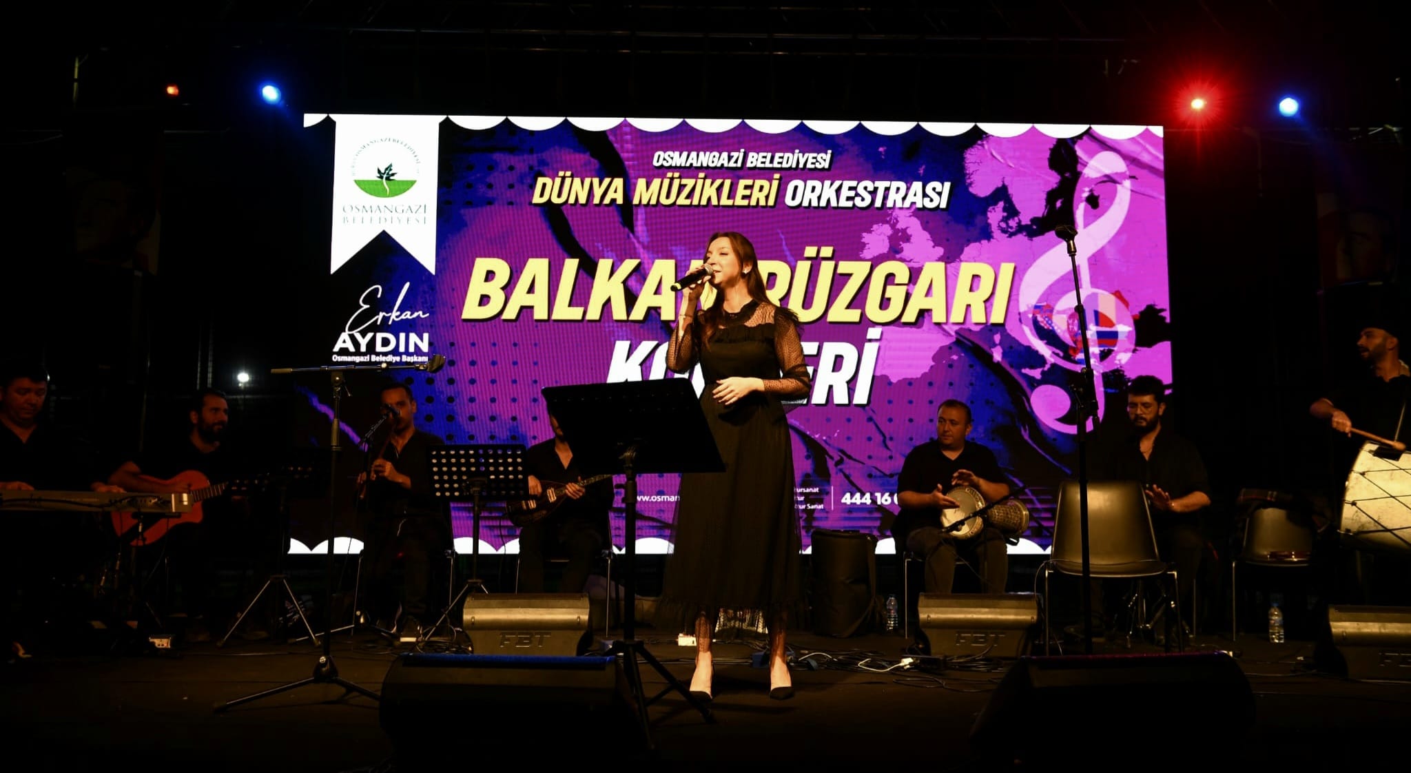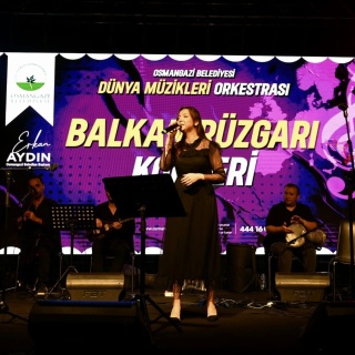 Ziraat Parkı’nda düzenlenen Balkan Rüzgarı konserinde, Balkanların en sevilen şarkıları hep bir ağızdan söylendi. Osmangazi Dünya Müzikleri Orkestrası tarafından çalınan şarkılar, Hatice Çiçek, Saynur Eren Süleymanoğlu ve Menteşeli Cengiz tarafından seslendirildi. Konsere katılan vatandaşlar, söylenen şarkılara hep bir ağızdan eşlik etti. Söylenen şarkılara dans gösterileri ile eşlik eden Osmangazi Halk Dansları Topluluğu da, geceye renk kattı. Osmangazili yurttaşların yoğun ilgi gösterdiği konsere, Osmangazi Belediye Başkan Yardımcısı Mutlu Esendemir ve belediye meclis üyeleri de katıldı.
