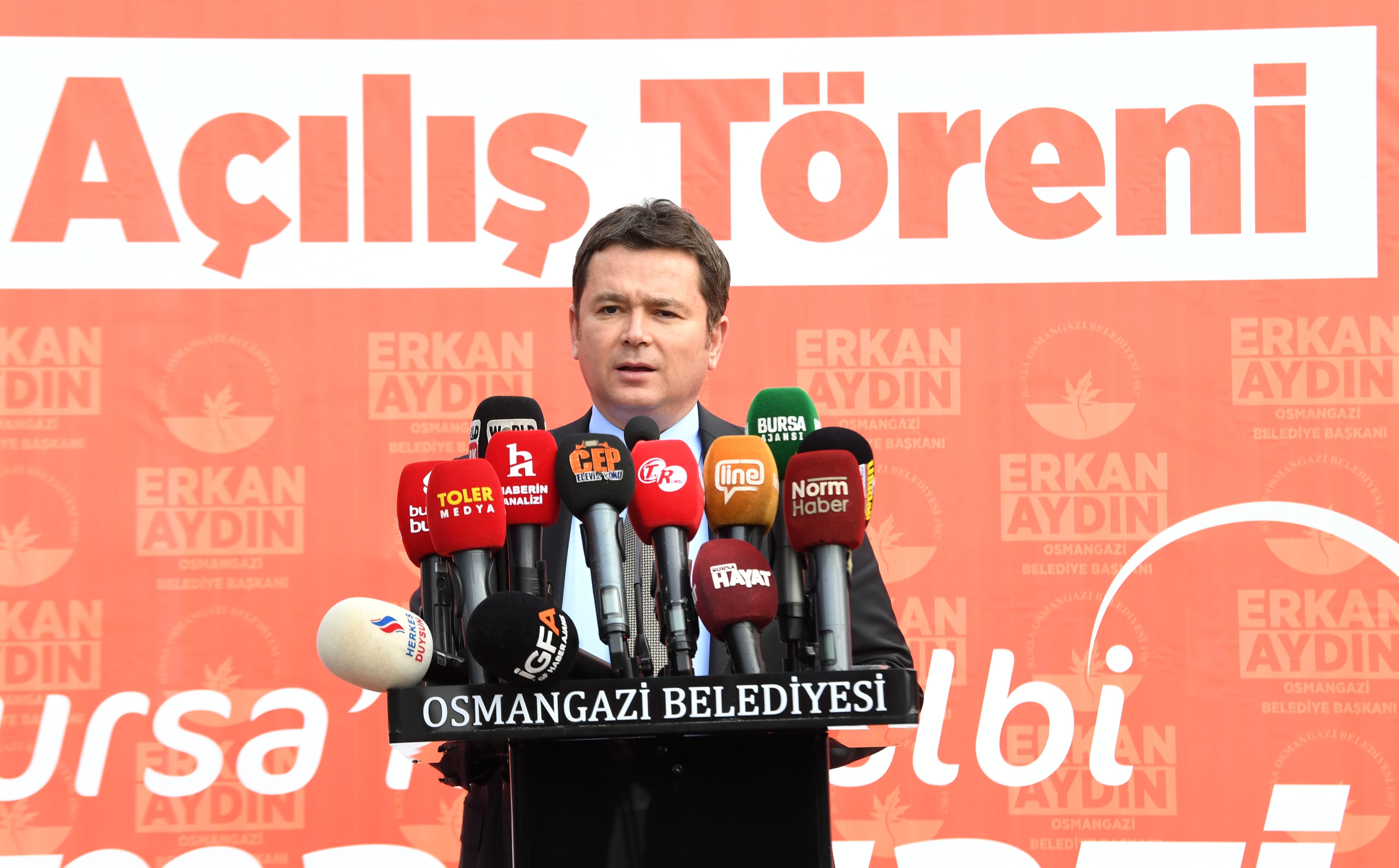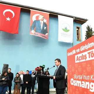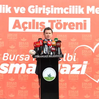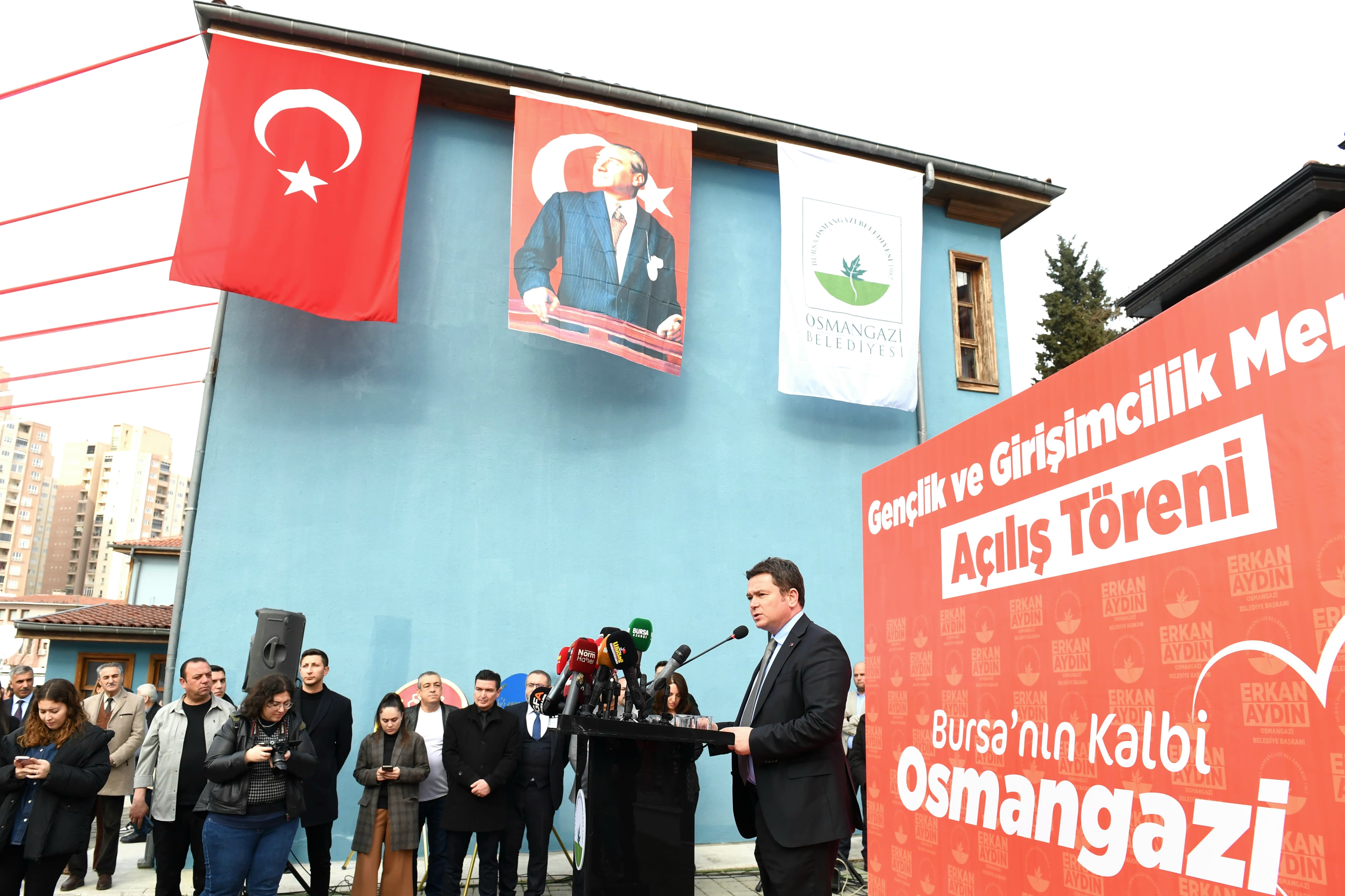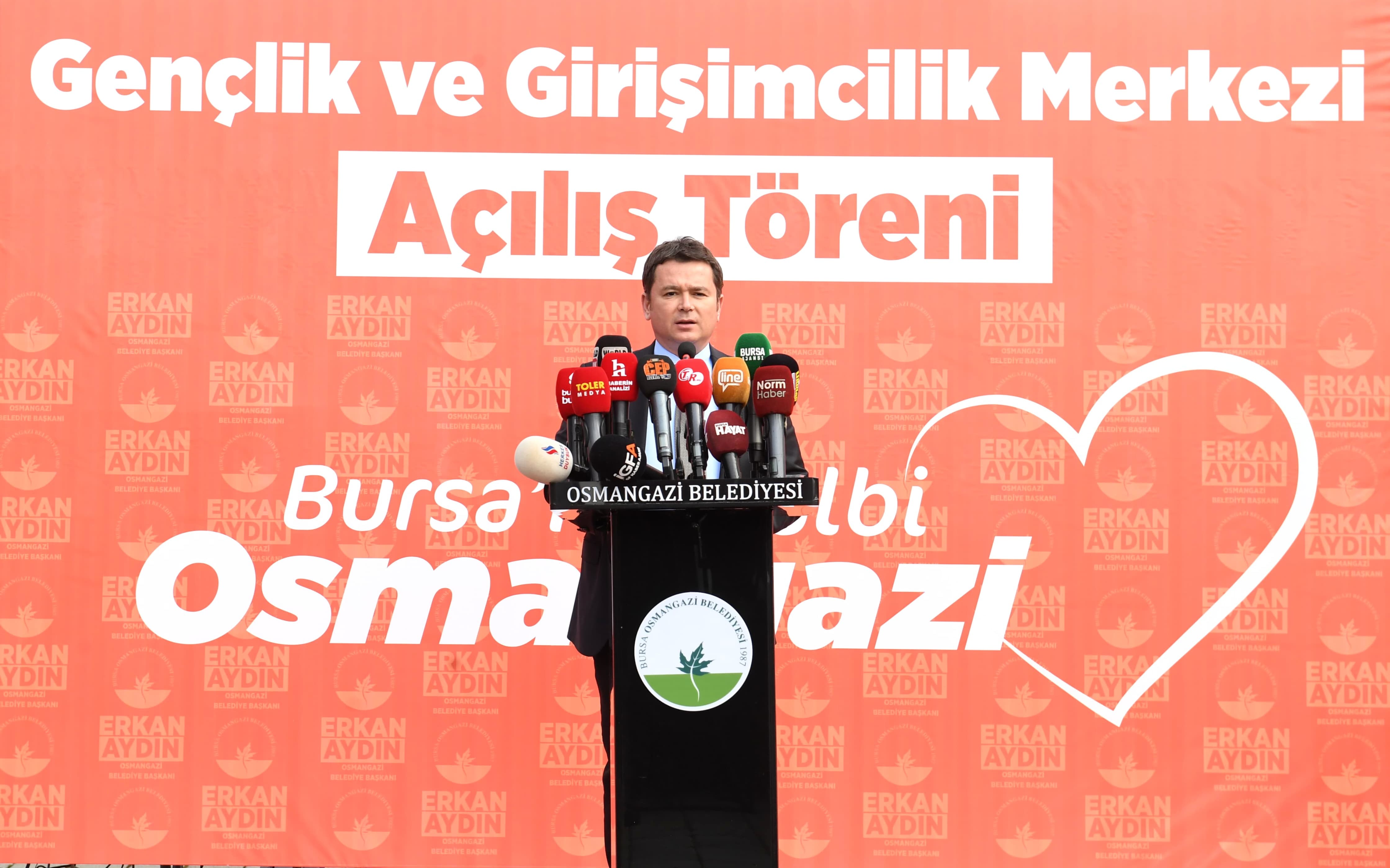 Osmangazi Belediye Başkanı Erkan Aydın, Gençlik ve Girişimcilik Merkezi’nin açılışında yaptığı konuşmada, “Büyük Önder Mustafa Kemal Atatürk’ün de dediği gibi bütün ümidimiz gençliktedir. Gençler için yapılan yatırımlar hepimizin yarınlarını kurtaracak ve daha müreffeh bir ülke olma anlamında da büyük katkılar sunacaktır. Bu düşünce çerçevesinde seçimden çok kısa süre sonra Bursa Ticaret Borsası Yönetim Kurulu Başkanımız Özer Matlı ile Hamidiye Tarım Mesleki ve Teknik Anadolu Lisesi’ni ziyaret ettik. Liseyi gezerken ortaklaşa nasıl bir proje üretebiliriz diye fikir alış verişinde bulunduk. Gençlerin bir araya gelip üretebileceği ve inovatif buluşlar yapabileceği, daha da önemlisi bunları yaptıktan sonra iş insanları ile bir araya gelebileceği bir merkez oluşturma fikri ortaya çıktı. Tophane Mesleki ve Teknik Anadolu Lisesi’ne yaptığımız ziyarette Mükemmeliyet Merkezi’nden bu tür çalışmalar olduğunu gördük. Bursa Erkek Lisesi’ne yaptığımız ziyarette ise gençlerin projeleri olduğunu ve bu projeleri hem hayata geçirmek hem de hayata geçirdikten sonra kalıcı olabilmesi için iş dünyası ile buluşması gerekliliği gerçeğini fark ettik” dedi.