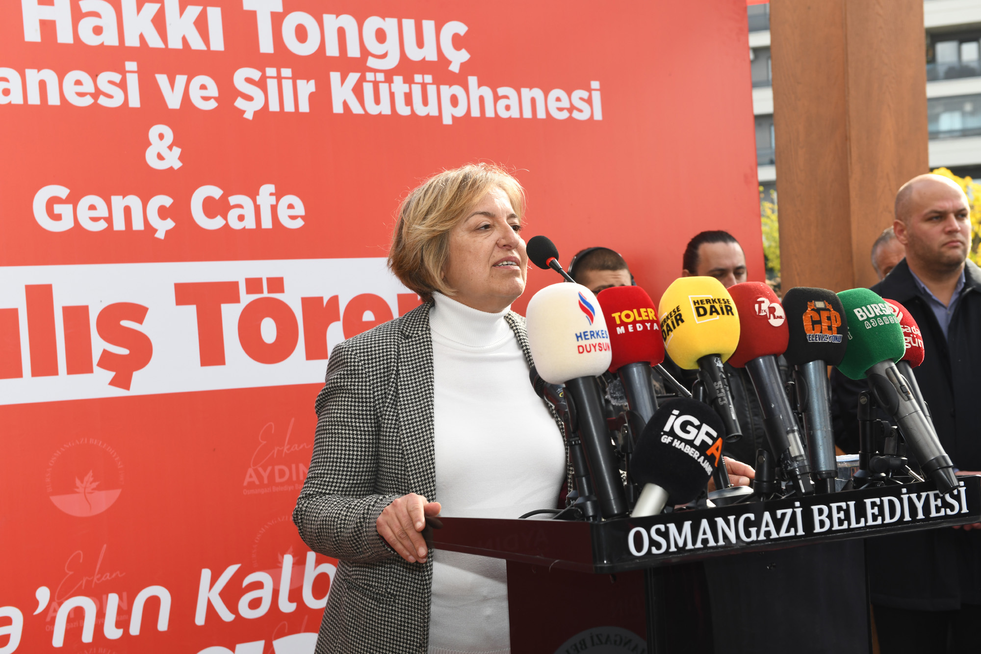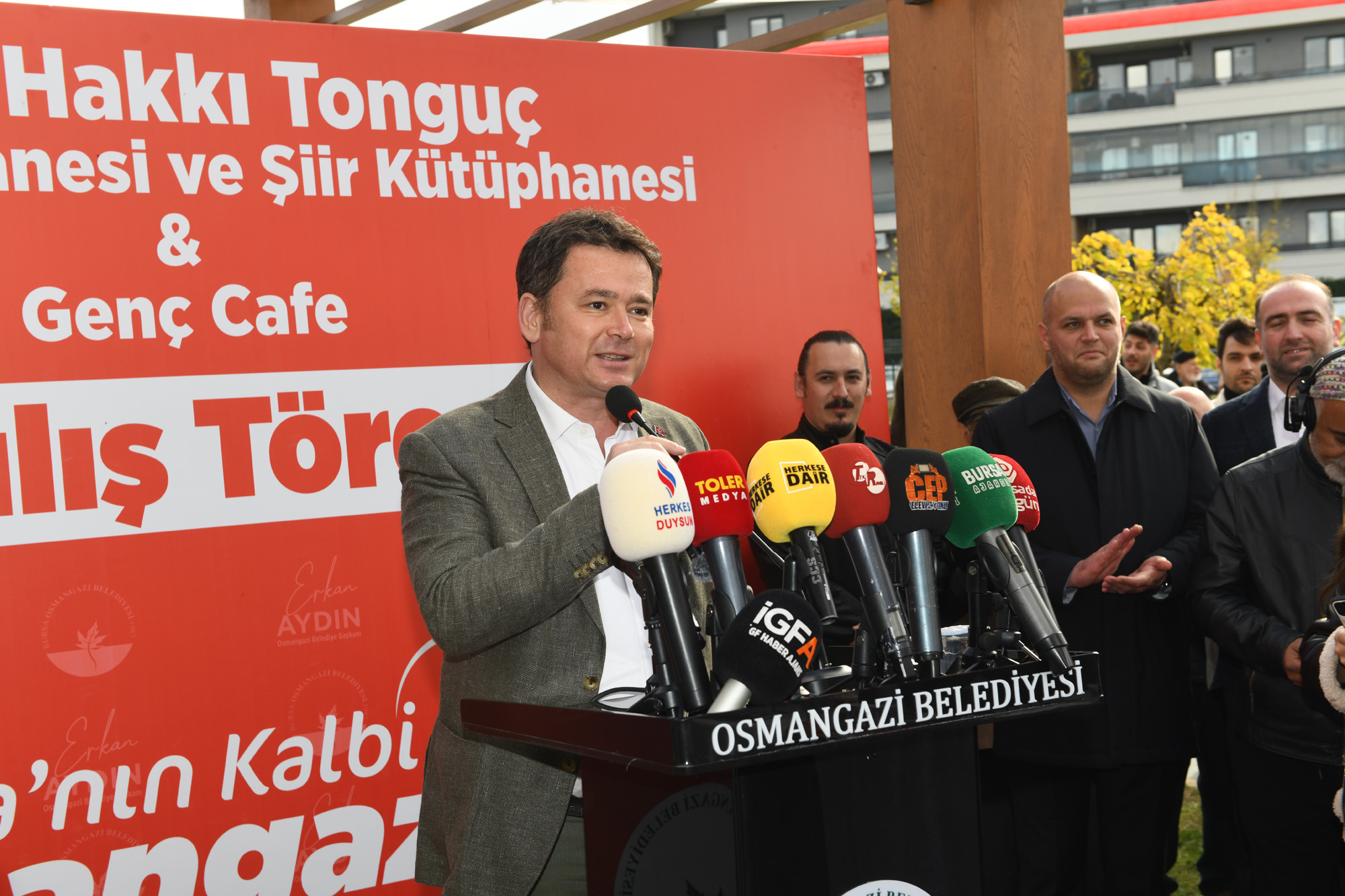 Osmangazi Belediye Başkanı Erkan Aydın, göreve başlamalarının ardından geçen 7 buçuk ay gibi kısa bir sürede, 22’inci açılış ve temel atma programını gerçekleştirdiklerini belirterek, “İsmail Hakkı Tonguç Bağış ve Şiir Kütüphanesi’nde önce, Osmangazi Meydanı’nda bulunan Hasan Ali Yücel Dünya Klasikleri Kütüphanesi ile Genç Kafe’nin açılışını yapmıştık. Bu açılışın ardından yaklaşık 5 ay geçti. Bu süreçte şunu gözlemledik; Gençlerimiz oraya gelerek sosyalleşiyor, öğrencilerimiz ders çalışıyor, vatandaşlarımız ise kitapları okuyarak kendi fikir ve kültür dünyalarını zenginleştiriyor. Bunu yaparken de uygun fiyata aldıkları kaliteli kahvelerini yudumlayabiliyorlar. Hemen yan tarafta yer alan Halk Lokantası’nda ise 80 liraya 4 çeşit yemek yiyebiliyorlar. Hatta paraları yoksa dahi askıda yemek ile ücretsiz olarak karınlarını doyurabiliyorlar. Aynı uygulamayı burada da hayata geçiriyoruz. Vatandaşlarımızdan aynı talebi göreceğimizi de düşünüyorum” dedi.