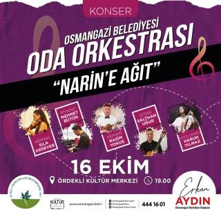 Osmangazi Belediyesi tarafından 16 Ekim Çarşamba günü saat 19.00’da gerçekleştirilecek olan Oda Orkestrası Konseri, Diyarbakır’da cinayete kurban giden 8 yaşındaki Narin Güran’a ağıt temasıyla gerçekleştirilecek.