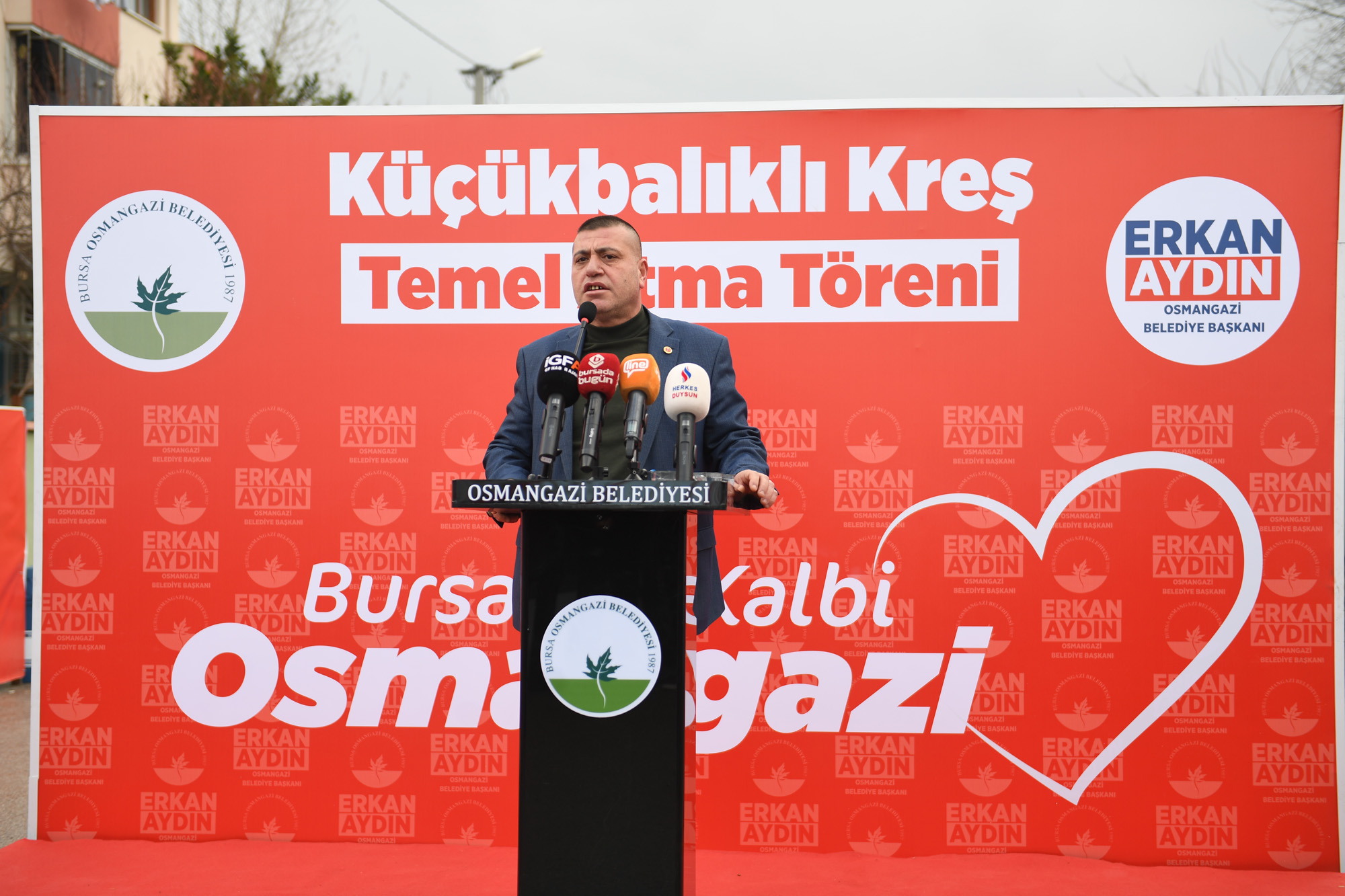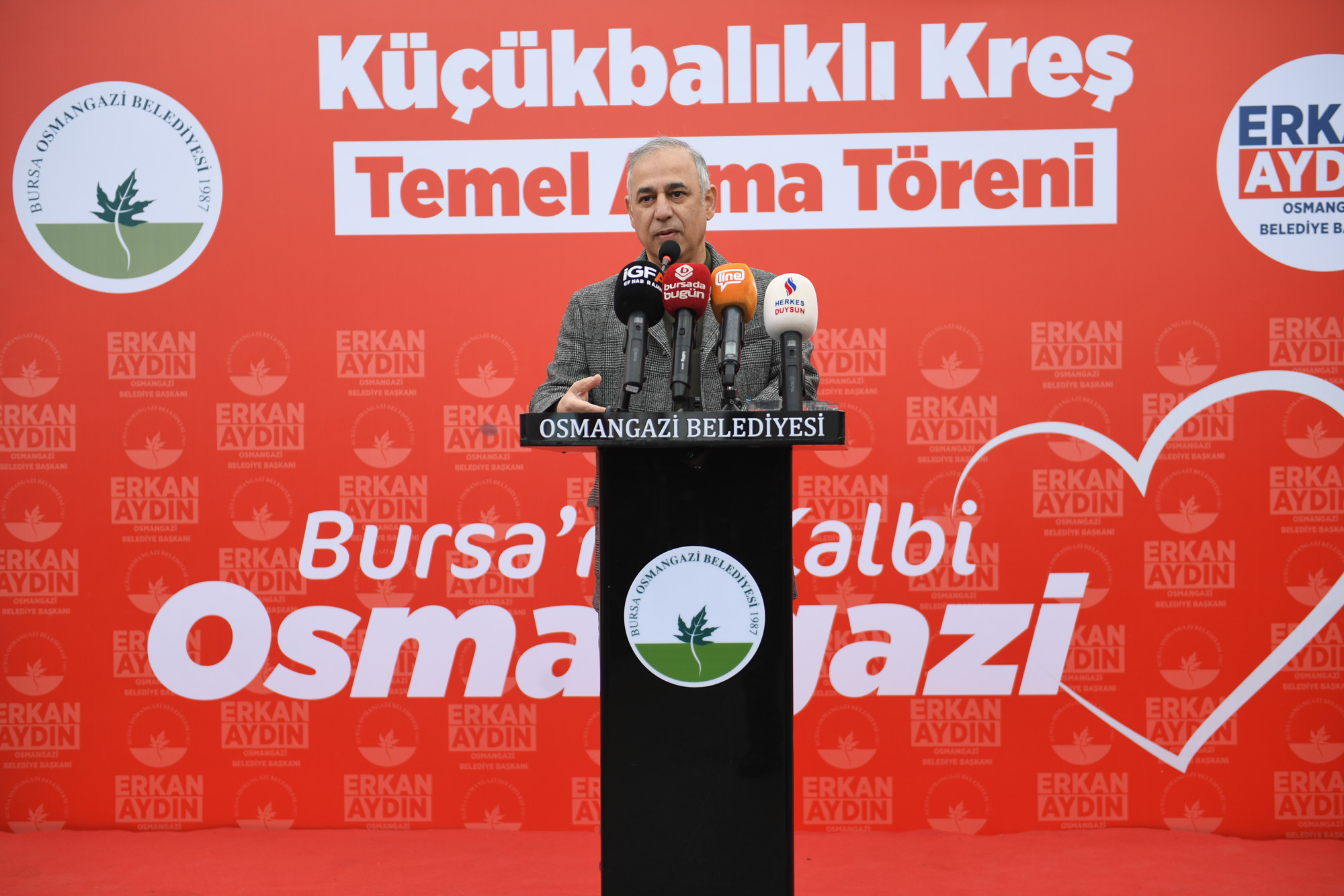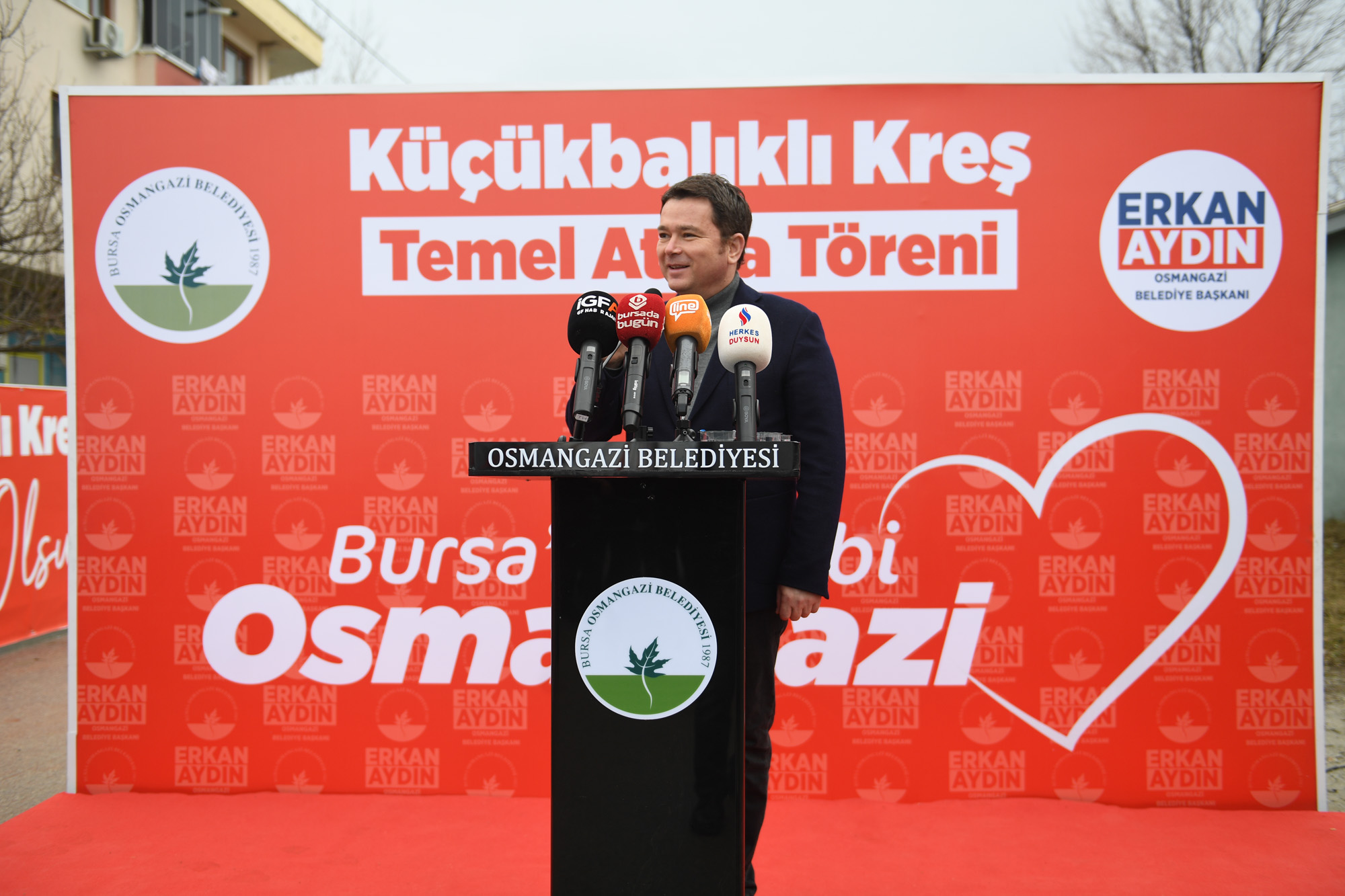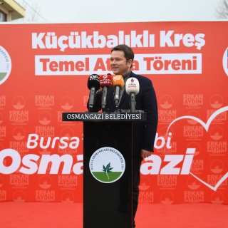 Yoğun bir katılımla gerçekleşen temel atma töreninde konuşan Osmangazi Belediye Başkanı Erkan Aydın, “Göreve başlamamızın ardından beşinci temel atmamızı gerçekleştiriyoruz. İlçemize kazandıracağımız dördüncü kreşin temelini atıyoruz. İlk kreşimizin temelini Mayıs ayında Hamitler mahallesinde attık ve inşaatını kısa sürede tamamlayarak Ekim ayında hizmete açtık. İkinci kreşimizin temelini Yunuseli mahallemizde attık. Küplüpınar mahallesinde üçüncü, bugün de Küçükbalıklı mahallemizde dördüncü kreşin temelini atıyoruz. Yılbaşından sonra da Türkan Saylan Kız Öğrenci Yurdu’nun temelini atacağız. Yapmış olduğumuz temel atmaları ve açılışları, şova yönelik hareket olarak algılayanlar olabiliyor. Ancak şunu bilsinler ki 5 yılın sonunda bu kreşlerde onlarca çocuk eğitim görecek. Vatanına milletine hayırlı işler yapacak çocuklar yetişecek. O yüzden ilçemize kreşler kazandırmayı önemsiyoruz. Daha önce tanışıklığımız olmamasına rağmen, kreş projemizden bahsettiğimizde hayırsever iş insanı Veysel bey, bizlere desteklerini sundu. Kendisine çok teşekkür ediyorum. Bu kreşte, rahmetli anneleri Hacı Remziye Bakgör’ün ismi yaşatılacak. Osmangazi belediyesi olarak, çalışmaya ve hizmet üretmeye de devam edeceğiz” diye konuştu.