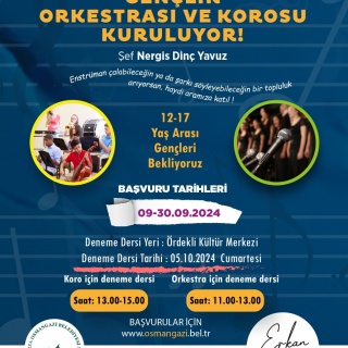 Osmangazi Belediyesi, müziğe gönül vermiş olan gençleri, Gençlik Orkestrası ve Korosu çatısı altında buluşturuyor. Sesine ve enstrüman çalma yeteneğine güvenen Osmangazili müzikseverlerin, Gençlik Orkestrası ve Korosu’na girebilmek için 30 Eylül 2024 tarihine kadar www.osmangazi.bel.tr adresinden başvuru yapması gerekiyor. 05 Kasım 2024 tarihinde Ördekli Kültür Merkezi’nde yapılacak olan deneme derslerinin ardından Gençlik Orkestrası ve Korosu’na girmeye hak kazanan genç müzisyenler, Şef Nergis Dinç Yavuz tarafından eğitim görecek. Koro ve orkestra üyeleri, verilen eğitim ve çalışmaların ardından Osmangazi Belediyesi etkinliklerinde sahne alarak sanatlarını sergileme şansına kavuşacak.