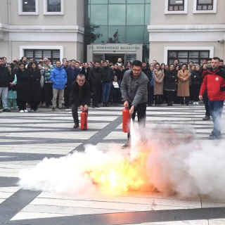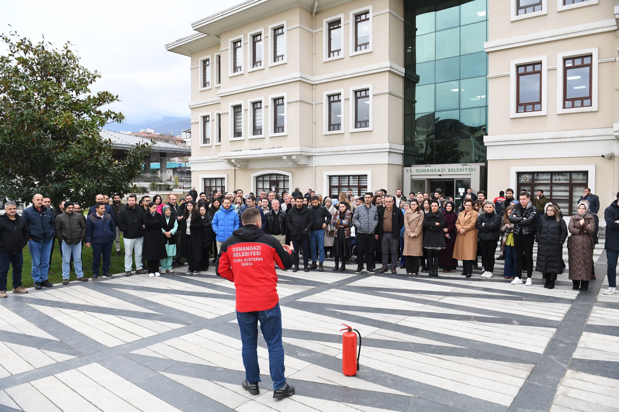 Afet İşleri Müdürlüğü personelinin yönlendirmesiyle Osmangazi Belediyesi merkez binası, 117 saniye gibi kısa sürede tümüyle tahliye edildi. Belediye binasının önünde toplanan personele Afet İşleri Müdürlüğü ekipleri, deprem ve yangın anında neler yapması gerektiğini uygulamalı olarak gösterdi. Ardından yakılan ateşe, doğru şekilde yangın söndürme tüpüyle nasıl müdahale edilmesi gerektiği anlatıldı.
