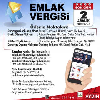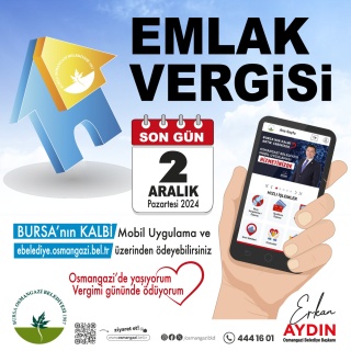 Emlak Vergisi’nin 2. taksiti için ödeme süresi 2 Aralık’ta sona eriyor. Vergi ödemelerini gerçekleştirmek isteyen Osmangazililer, hafta içi 08.00-17.00 saatleri arasında TC kimlik numarası veya üye sicil numarası ile Osmangazi Belediyesi Ana Binası ile Emek, Nilüfer Köylü Pazarı ve Demirtaş’ta yer alan ödeme noktalarındaki veznelerde ödemelerini nakit veya kredi kartı ile gerçekleştirebilecek.