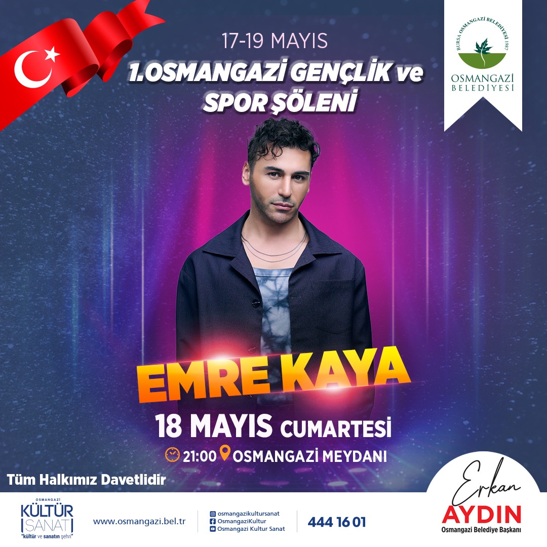19 Mayıs Atatürk'ü Anma, Gençlik ve Spor Bayramı kutlamaları, 18 Mayıs Cumartesi günü de dolu dolu devam edecek. Sokak basketbolu turnuvası ve masa tenisi turnuvası gibi sportif etkinliklerin yanı sıra eğlence dolu etkinlikler ile devam edecek olan 1. Osmangazi Gençlik ve Spor Şöleni'nin ikinci gününde Türk pop müziğinin sevilen ismi Emre Kaya, Osmangazi Meydanı'nı dolduran binlerce genç için sahnede olacak. Ünlü şarkıcının seslendireceği şarkılara eşlik edecek olan gençler, 19 Mayıs coşkusunu doyasıya yaşamanın keyfine varacak.