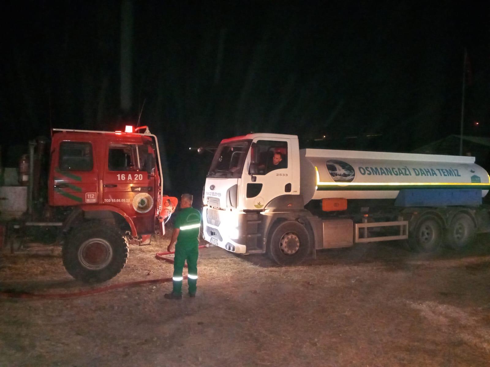 Osmangazi Belediyesi, Büyükorhan ilçesinde çıkan orman yangınına müdahale etmek için bölgeye sevk ettiği su tankerleri ve iş makineleri ile söndürme çalışmalarına destek oluyor.