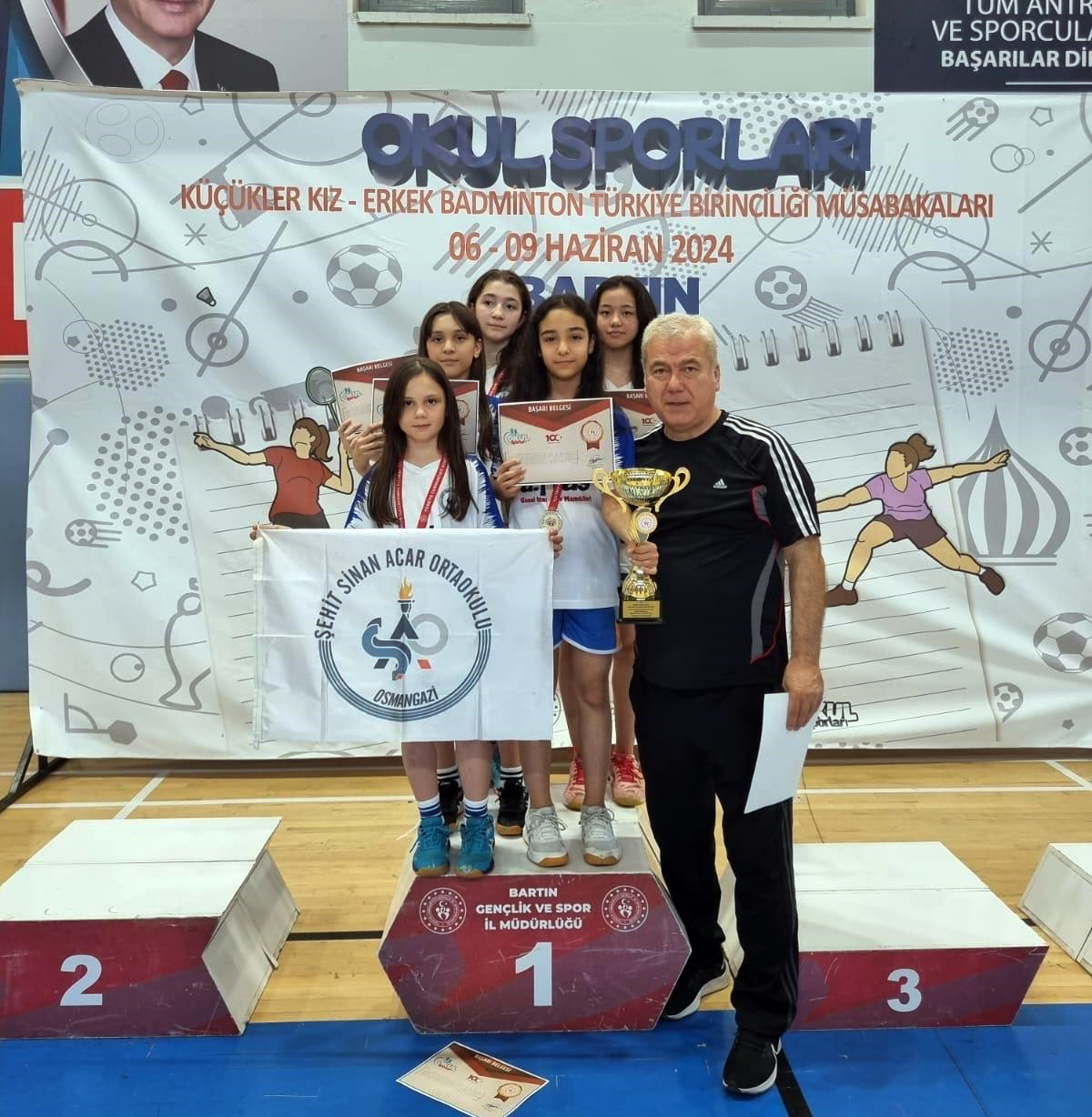 Osmangazi Belediyespor Kulübü sporcularından oluşan Şehit Sinan Acar Ortaokulu Kız Badminton Takımı, Bartın’da düzenlenen Okul Sporları Badminton Küçükler Kız-Erkek Badminton Türkiye Birinciliği Müsabakaları’nda Türkiye şampiyonu oldu.