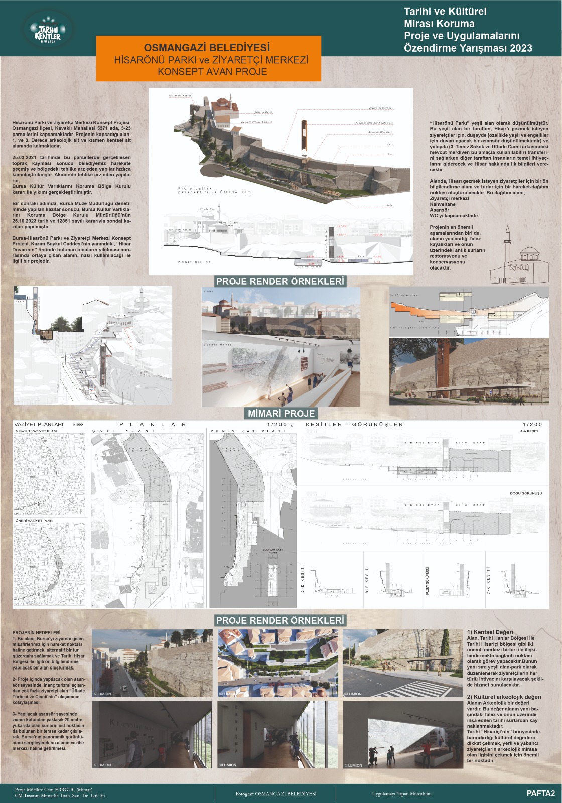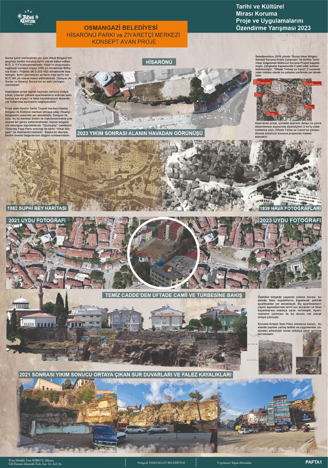 Osmangazi Belediyesi, ‘Hisarönü Parkı ve Ziyaretçi Merkezi Konsept Projesi’ ile Tarihi Kentler Birliği’nin 23. Tarihi ve Kültürel Mirası Koruma Proje ve Uygulamalarını Özendirme Yarışması’nda süreklilik ödülüne layık görüldü.