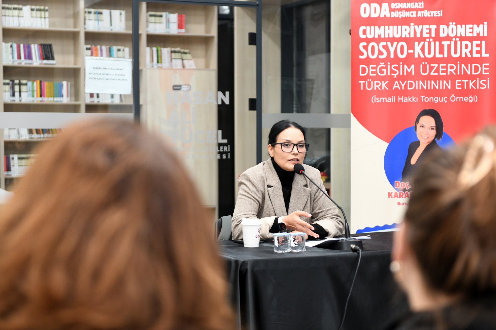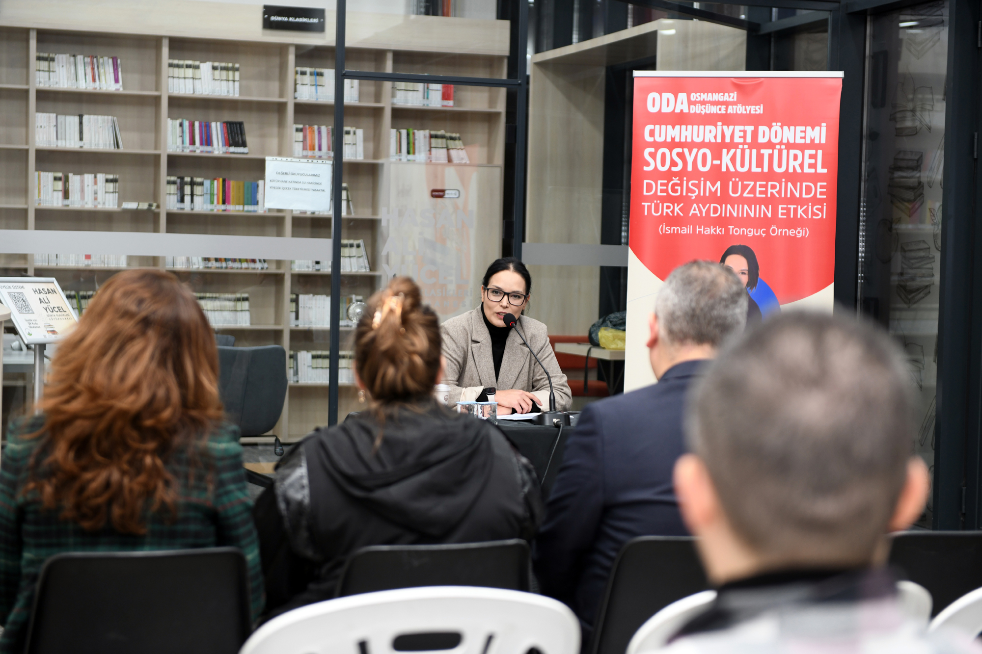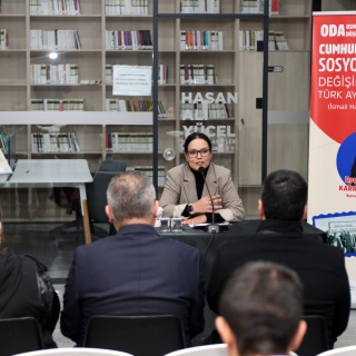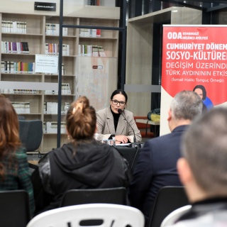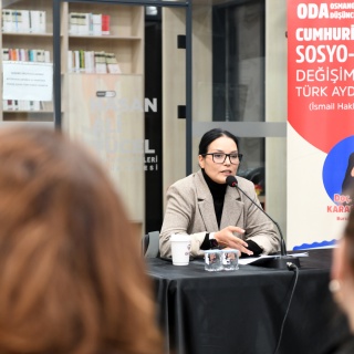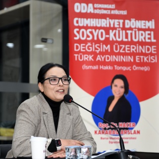 Hasan Ali Yücel Dünya Klasikleri Kütüphanesi’nde gerçekleşen ‘Cumhuriyet Dönemi Sosyo-Kültürel Değişim Üzerinde Türk Aydınının Etkisi’ konulu söyleşide, Bursa Uludağ Üniversitesi Öğretim Üyesi Doç. Dr. Hacer Karabağ Arslan, Köy Enstitülerinin kurucularından İsmail Hakkı Tonguç örneğini işledi. İsmail Hakkı Tonguç’un önemli bir Türk aydını olduğunu söyleyen Doç. Dr. Hacer Karabağ Arslan, “Cumhuriyet’in ilanıyla birlikte Türkiye, modernleşme ve kalkınma hedefleri doğrultusunda kapsamlı bir dönüşüm sürecine girdi. Bu süreçte, eğitimin rolü hayati bir önem taşıyordu. Cumhuriyet, yalnızca siyasi bağımsızlığı değil, aynı zamanda toplumsal yapının eğitim, kültür ve ekonomi gibi alanlarda modernleştirilmesini de hedeflemiştir. Bu bağlamda Türk aydınları, özellikle halkın bilinçlendirilmesi ve kırsal kalkınmanın sağlanması noktasında önemli bir sorumluluk üstlenmiştir. İsmail Hakkı Tonguç, bu aydınlar arasında hem düşünceleri hem de uygulamalarıyla öne çıkan isimlerden biridir” dedi.