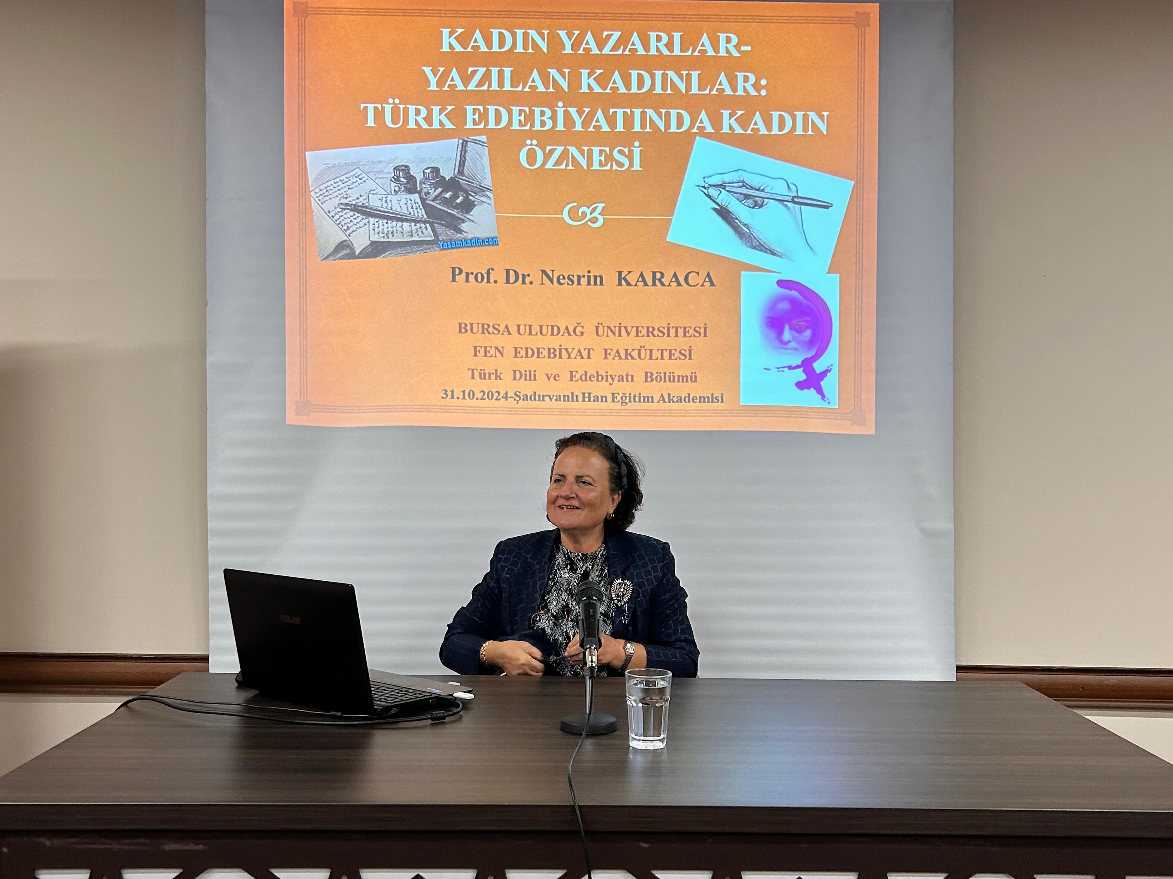 Şadırvanlı Han Eğitim Akademisi’nin ev sahipliğini yaptığı “Kadın Yazarlar-Yazılan Kadınlar: Türk Edebiyatında Kadın Öznesi” adlı konferans, Prof. Dr. Nesrin Karaca’nın sunumuyla gerçekleşti. Konferansta, Türk edebiyatında yalnızca erkeklerin değil, kadınların da geniş bir eser külliyatına sahip olduğu ve hem klasik hem de modern dönemde şair, romancı ve öykücü olarak aktif bir rol üstlendikleri vurgulandı.