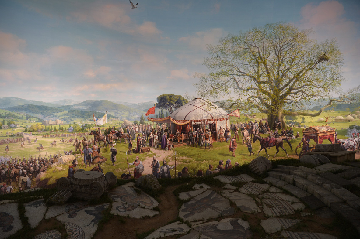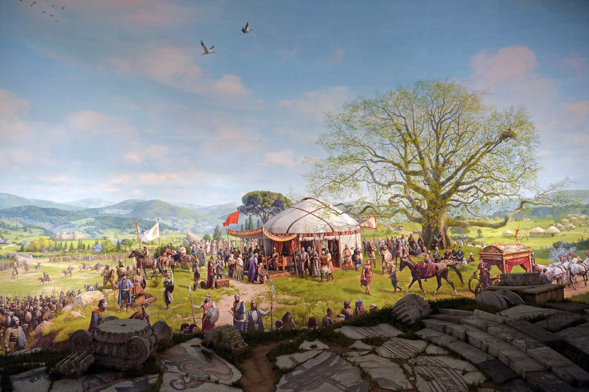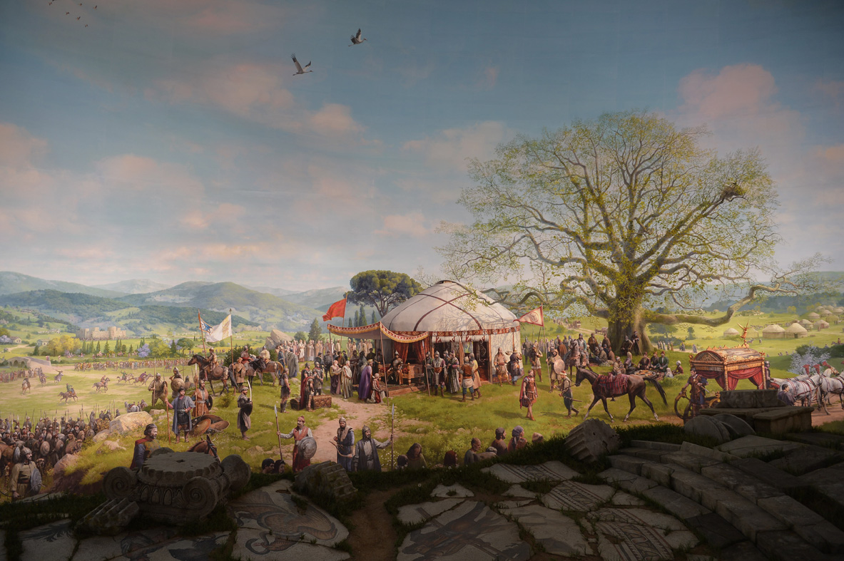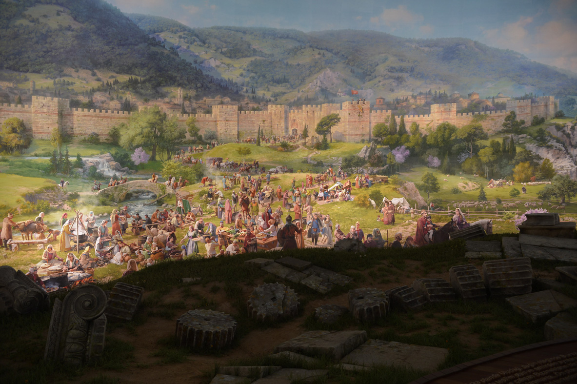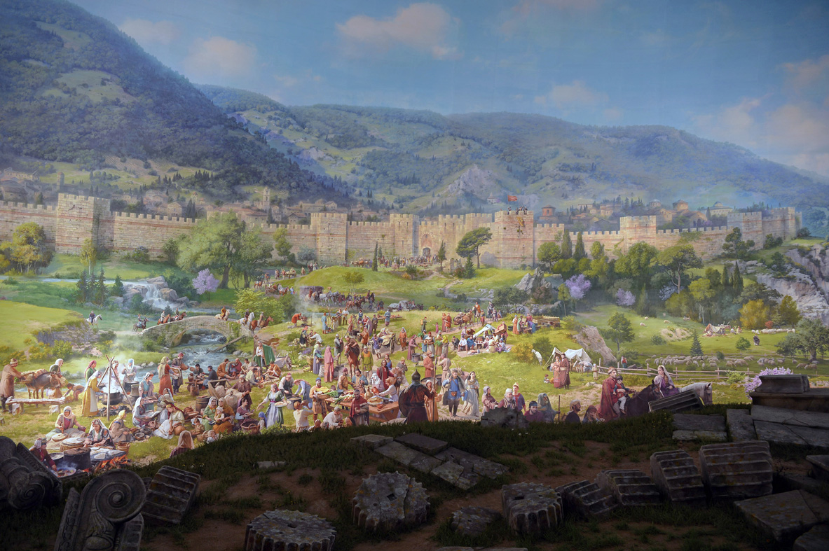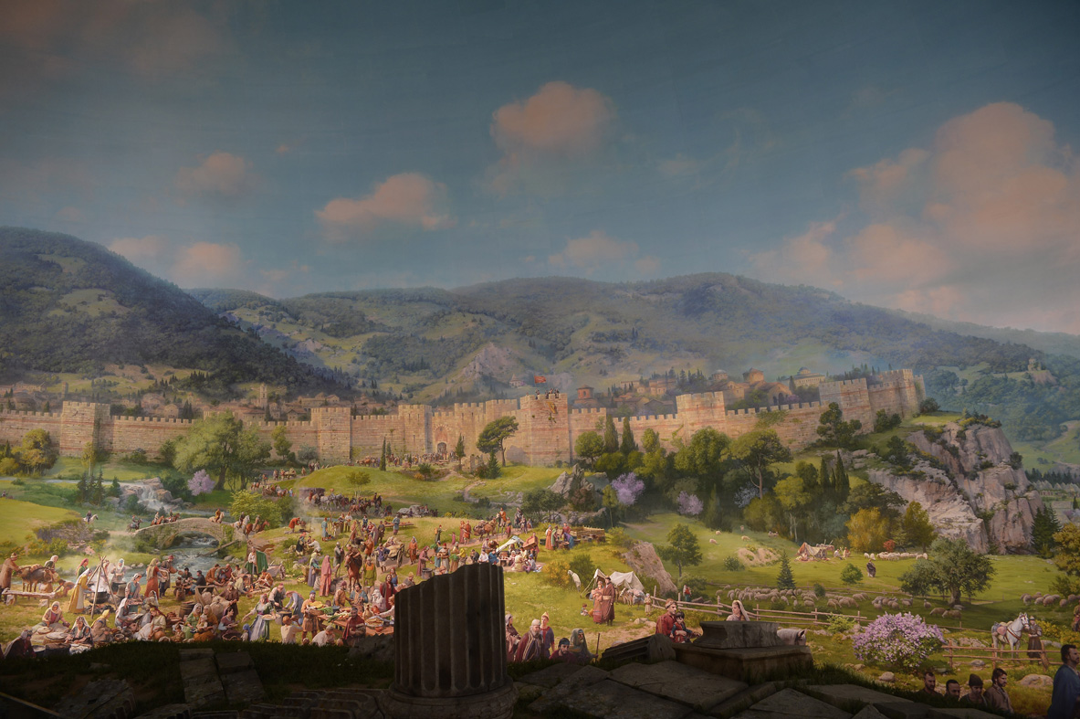 - Kubbe içerisindeki yaklaşık 2.500 m² yüzeyi kaplayan Panoramik resimde 10 bin insan ve hayvan figürü, Osmanlı ve Bizans döneminde kullanılan askeri ve sivil kıyafetler, araç gereçler ve dönemin mimari özellikleri, titiz araştırmalar sonucunda tarihi kaynaklara ulaşarak, her biri alanında uzman Danışma Kurulu Üyelerimizin katkılarıyla resmedildi.